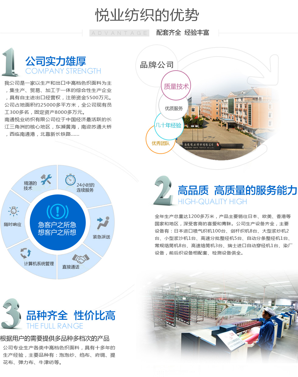 南通悅業紡織有限公司位于中國經濟最活躍的長江三角洲的核心地區、中國近代第一城—江蘇省南通市,是一家以生產和出口中高檔色織布為主業的集生產、貿易、加工于一體的企業,具有進出口經營權,注冊資金5500萬元。 公司常年生產各類中高檔色織面料,品種有:全棉色織布,cvc、T/C、青年布...